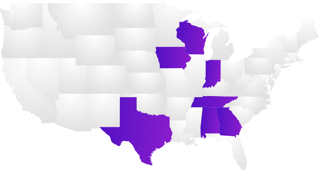 Georgia, Indiana, Iowa, Tennessee, Texas, Wisconsin