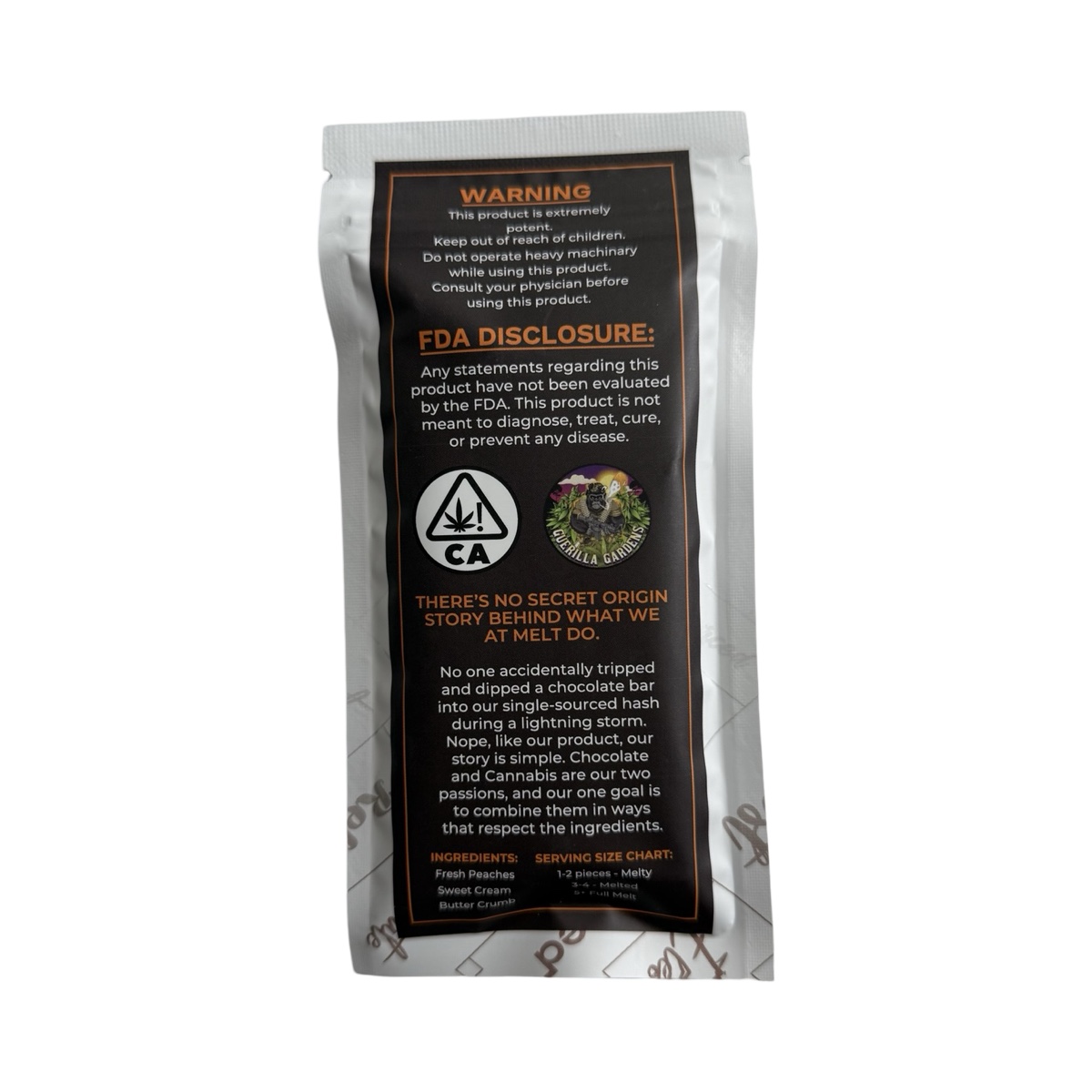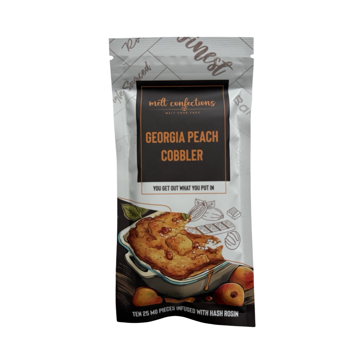 Crafted with real hash rosin, this flavor bomb wraps creamy, buttery peach cobbler flavor into rich chocolate squares, delivering 10 pieces at 25MG THC each. 🍫